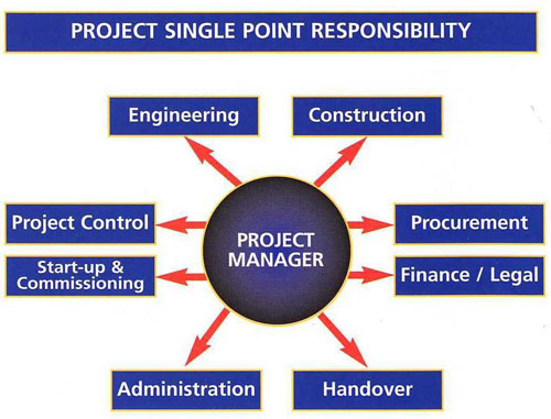 The single point project management responsibility provides the project with a swift decision making process, enhances communication with the customer, and provides a full sense of "ownership". Its objective is to identify, monitor, and correct any deviations from the original scope of work quality, cost, and schedule.