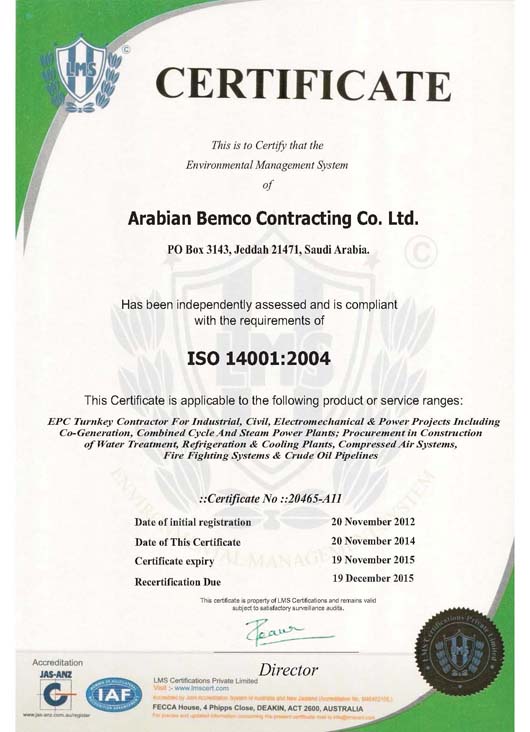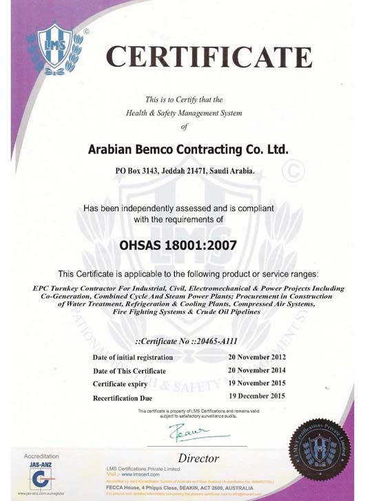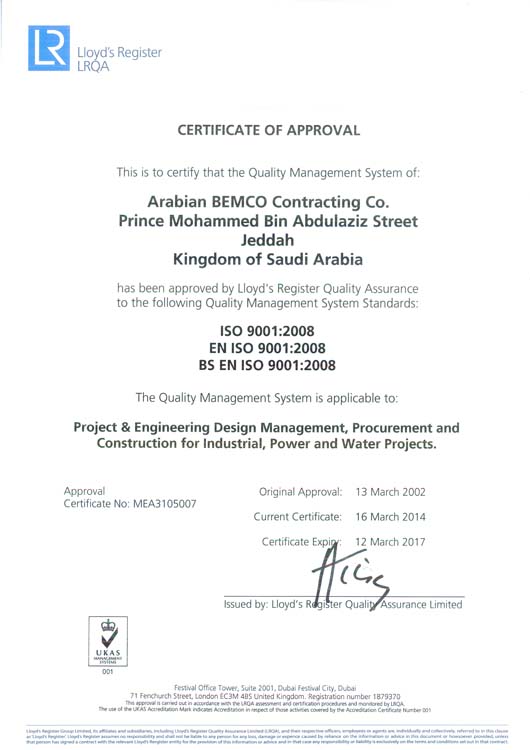 Quality is an obsession in BEMCO’s culture. Strict Quality Control Procedures related to Management, Engineering, Procurement, Selection of Vendors/Subcontractors, and at the construction site, are designed to ensure the highest grade of excellence. Such meticulous procedures for quality produce client satisfaction, repeated business, and avoidance of risk. BEMCO scrutinizes down to the minor details its work to enhance not only the performance of the complete system it installs, but also to ensure that its finished work is aesthetically pleasant. BEMCO is a pioneer in obtaining and implementing the ISO 9001 Certification for Engineering, Design, Management, Procurement, and Construction since 1994. Certificates: Arabian BEMCO is ISO 9001:2000 certified company and complies with various ISO and international standards to meet contractual and regulatory requirements. The policy of Arabian BEMCO is to deliver products and services to the client in conformance with contract requirements, on time, and free of defect. For this purpose Arabian BEMCO has developed and maintained a Quality Management System in accordance with ISO 9001:2000 (See Under Quality Assurance) In addition to QMS, Arabian BEMCO develops quality plans for each project as per ISO 10005, Quality Management: Guidelines for Quality Plans. Periodic Auditing as per ISO 19011, Guidelines for quality and environment management systems auditing, is carried out to ensure implementation of project plan. Arabian BEMCO has been given a certificate of approval by Lloyd’s Register Quality Assurance the following Quality Management System Standards: